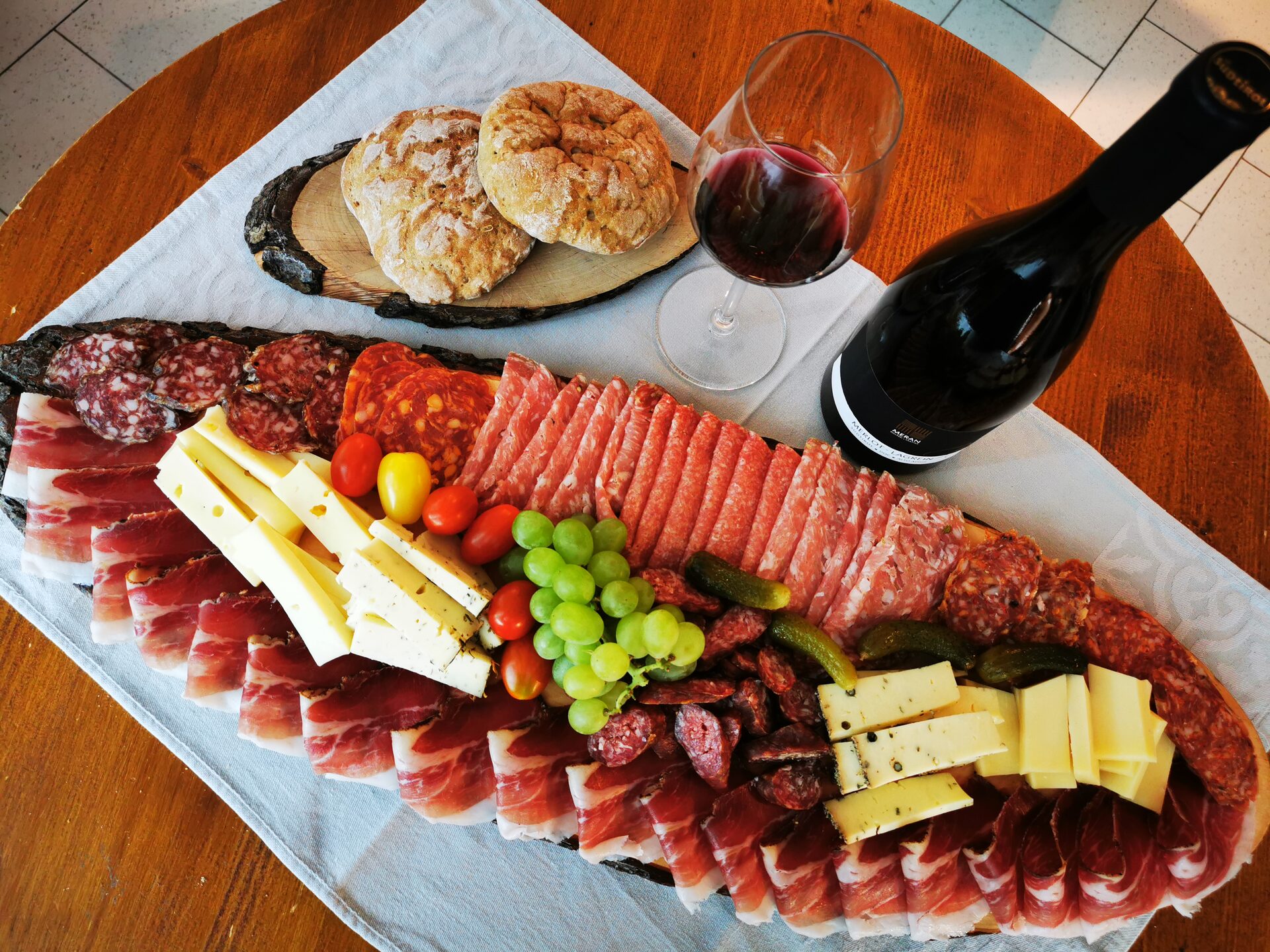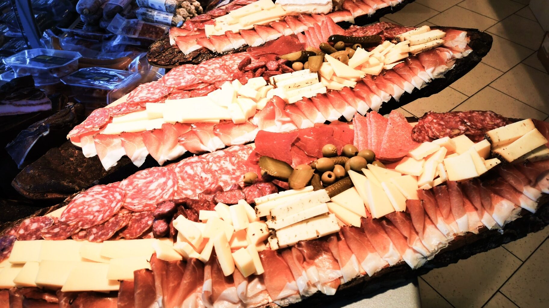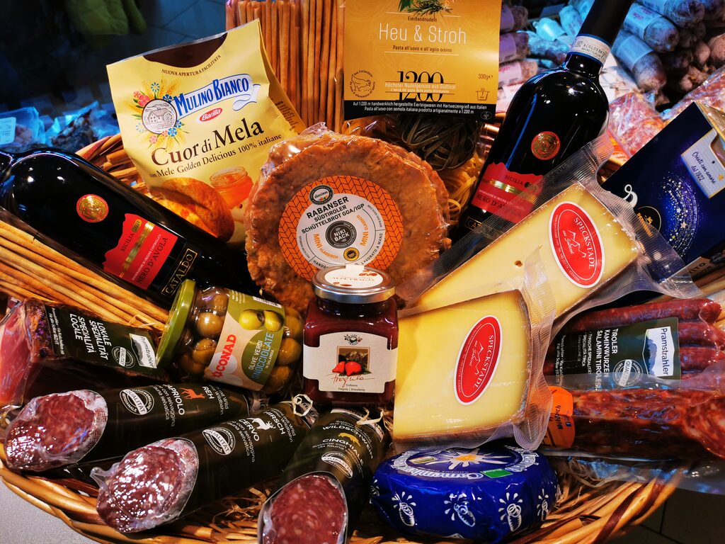 Südtiroler Speck, verschiedenen Salamis, mildem und würzigem Bergkäse, Kaminwurzen und noch vieles mehr...